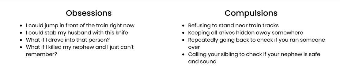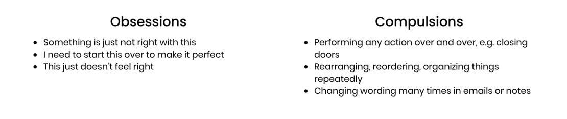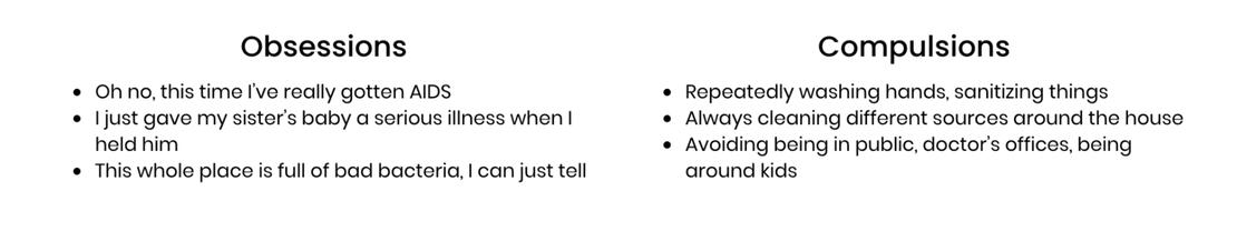 obsessions are repeated thoughts, urges, or mental images that cause anxiety. the two obsessions that you've probably heard the most about are fear of germs/contamination and the need to have things in perfect order.