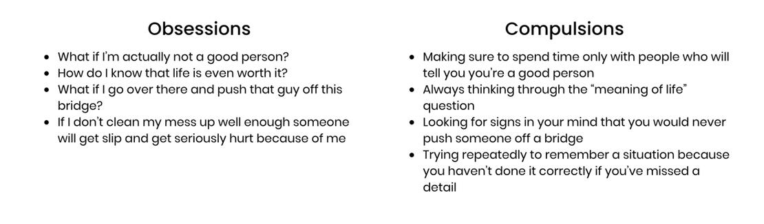this subtype of ocd includes individuals with unwanted obsessions that are often of religious, violent, or sexual nature. this groups compulsions aren't shown as openly as others, which is why they have often been referred to as "purely obsessional." this of course isn't the case. they still have compulsions, they just aren't displayed as openly. their compulsions consist of mental compulsions and reassurance-seeking. more specifically, because their obsessive thoughts severely violate their morals or values, their compulsions may include disrespectful thoughts about religious figures and impulses to do violent things.